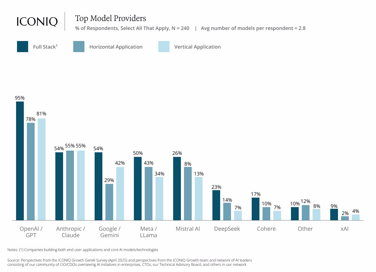 How they’re building: Companies are converging on multi-model architectures to optimize for performance, cost, and use case specificity, with 2.8 models used on average per respondent for customer-facing products.